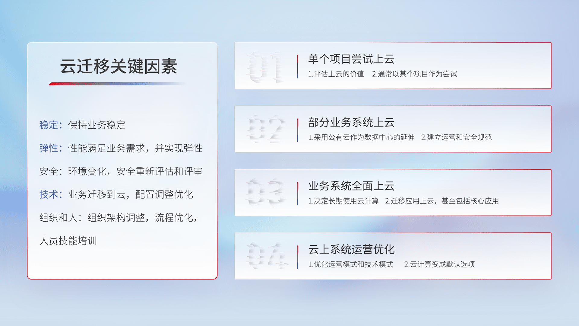 结合实际业务,,,从规划设计、、、、云平台选型、、、云原生改造、、、、数据迁移、、、、集成交付,,,迁移全过程为客户识别最佳上云路径,,做好风险识别管理,,设计网络架构、、身份权限、、、安全审计合规、、、、操作审计、、、、日志审计、、、、监控告警策略、、多站点容灾设计等,,,对云上基础设施进行整体规划,,提升IT治理水平,,以满足弹性、、、高可用、、、、高性能的需求。。