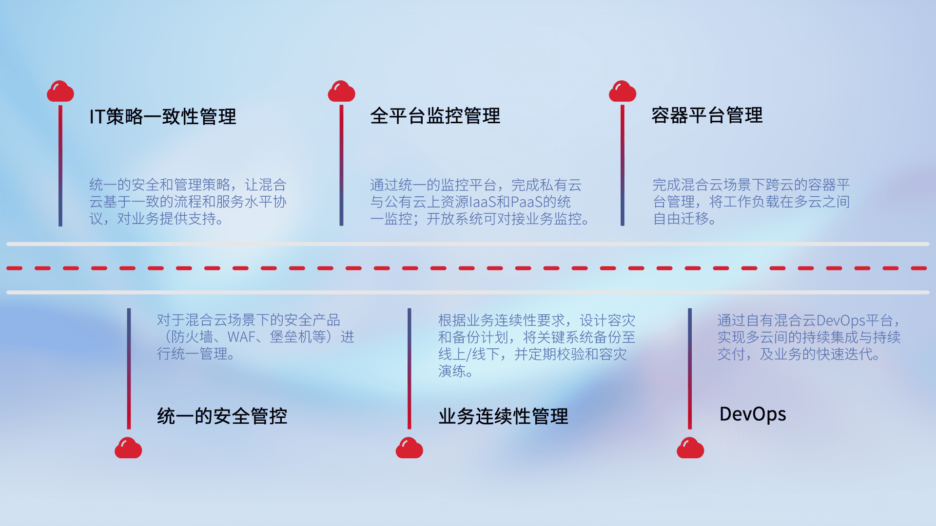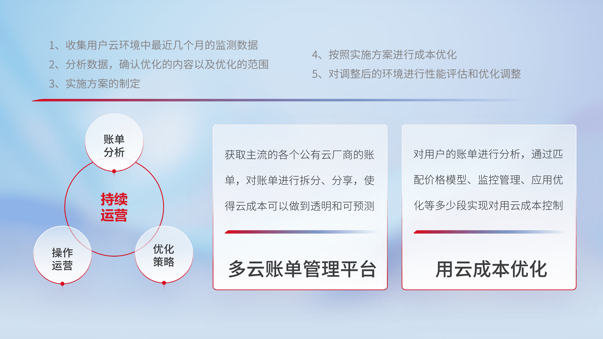 通过多云纳管,,以统一的资源数据模型把客户的云资源进行抽象和封装,,,进而实现对多云资源的统一操作,,保障云资源管理的可靠性、、稳定性与可用性。。。量身定制化运维内容,,配置、、、、开发运维、、补丁管理、、备份、、监控、、认证和访问管理、、、、审计和日常巡检等,,,,保障在用云过程中的可靠度,,稳定度以及高可用率。。。
