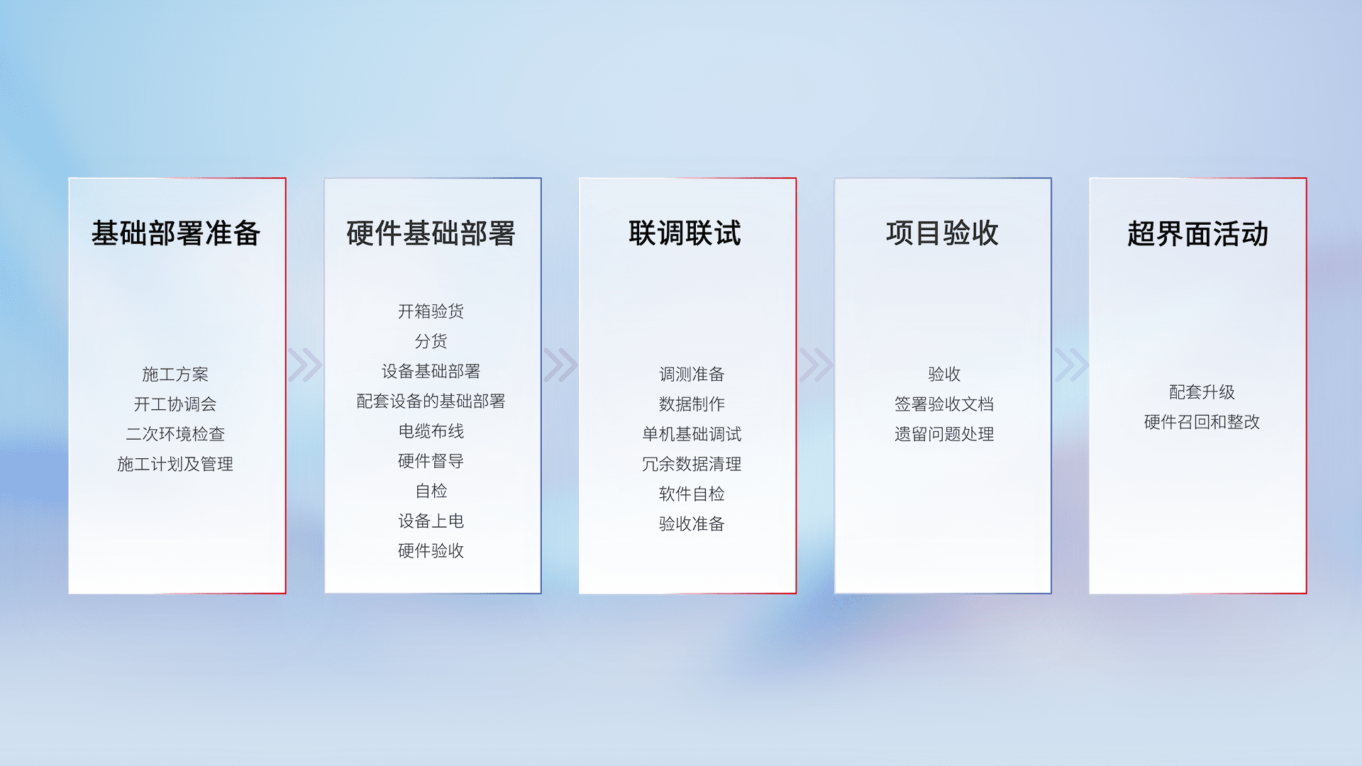 从基础部署准备、、、、硬件基础部署、、、联调联试、、、、项目验收、、、越界面活动的全过程可追溯,,保证施工质量和进度。。。。